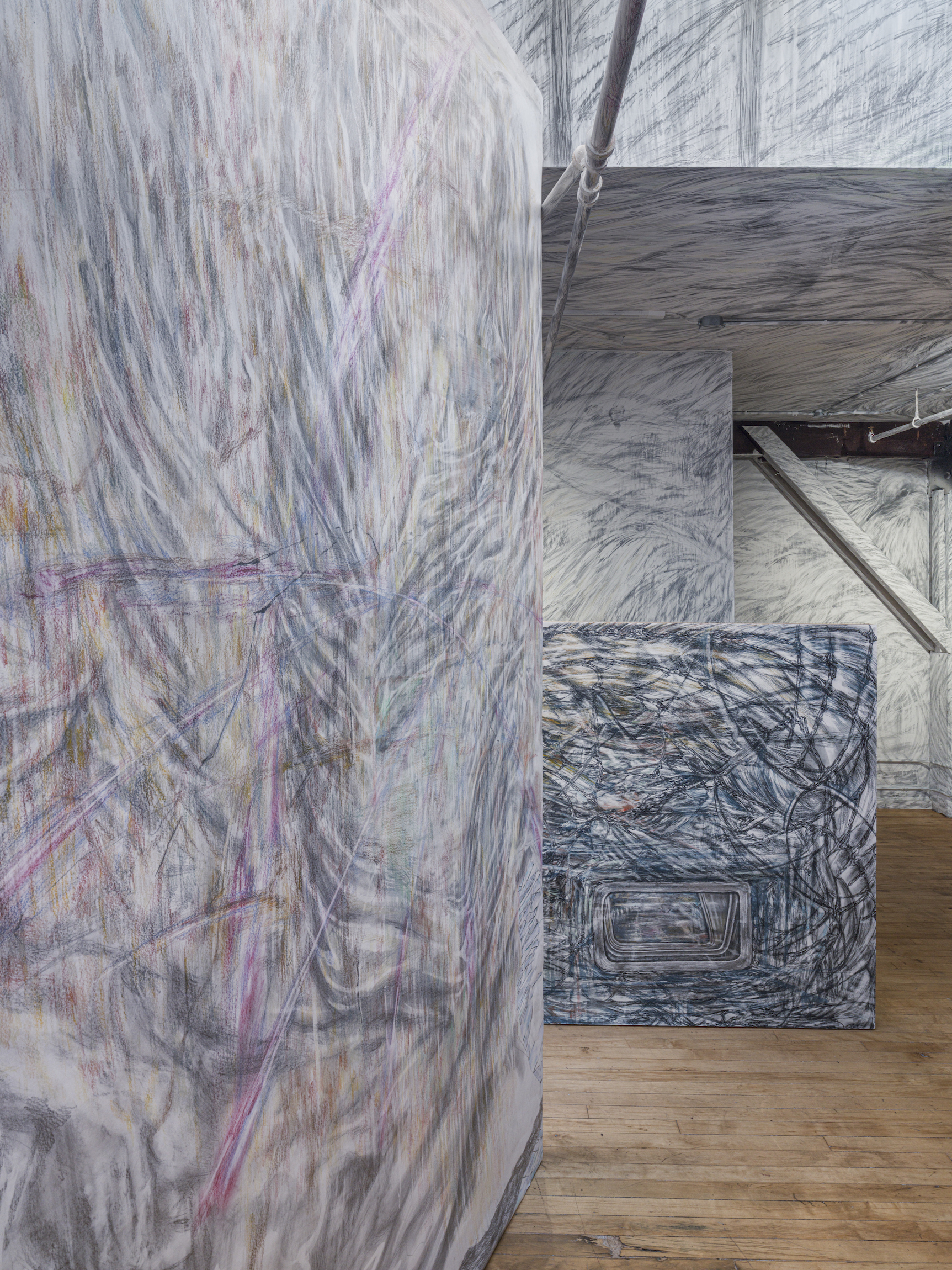 Carrier Pigeon is an immersive artwork by Jun Lee. Viewers walk between four large-scale drawings surrounded on all sides by graphite illustrations meant to track a carrier pigeon’s path to maintain altitude over the course of a flight. Each drawing was produced over many days in relative isolation and condenses several weeks of Jun’s life into a multilayered, symbolically dense artifact. Taken together, we are given four images of Jun's life and preoccupations over six months. Jun's quasi-monastic artistic practice has yielded a unique visual language that at times asks viewers to play the role of interpreter/codebreaker. The title of the show, Carrier Pigeon, makes reference to the (until recently) widespread use of pigeons to transport messages over long distances. Jun's interest in the bird's historical role of transmitter of sensitive information in hostile environments, together with his own distrust of faster, modern means of communication, has turned the animal into something of a talisman. The work directs our attention to life in the city: the pace of our lives here, the dispersion of our attentions, and the occasionally dizzying degree of social integration required to maintain it all.